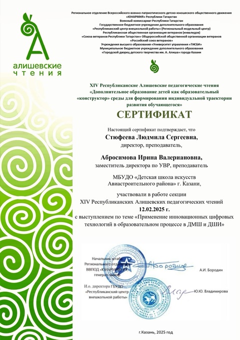 20. XIV Республиканские Алишевские педагогические чтения "Дополнительное образование детей как образовательный "конструктор" среды для формирования индивидуальной траектории развития обучающегося", выступление на тему "Применение инновационных цифровых технологий в образовательном процессе в ДМШ и ДШИ", Стюфеева Л.С., Абросимова И.В., 2025г, г.Казань;