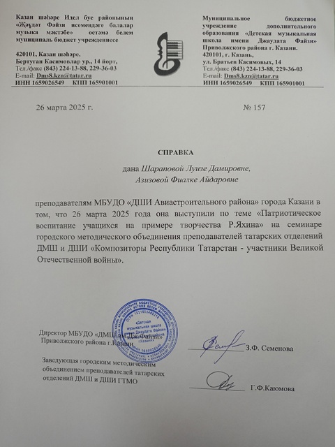 2. Городское методическое объединение преподавателей татарских отделений ДМШ и ДШИ г.Казани, Семинар "Композиторы Республики Татарстан - участники ВОВ", выступление по теме "Патриотическое воспитание учащихся на примере творчества Р.Яхина", Справка, Азизова Ф.А., Шарапова Л.Д.; 2025г., г.Казань;