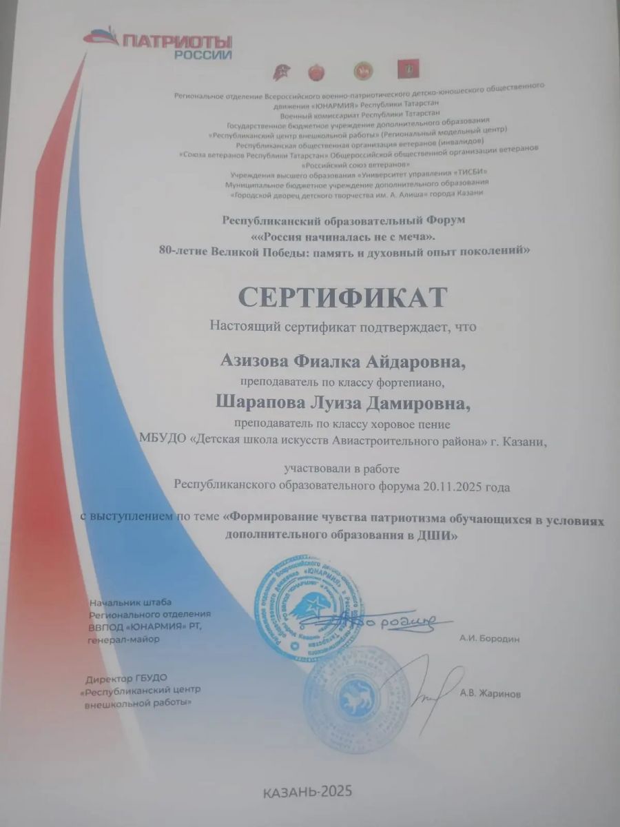 4. Республиканский образовательный форум "Россия начиналась не с меча. 80-летие Великой Победы: память и духовный опыт поколений", выступление на тему "Формирование чувства патриотизма обучающихся в условиях дополнительного образования в ДШИ", Азизова Ф.А., Шарапова Л.Д., г. Казань, 2025г.;