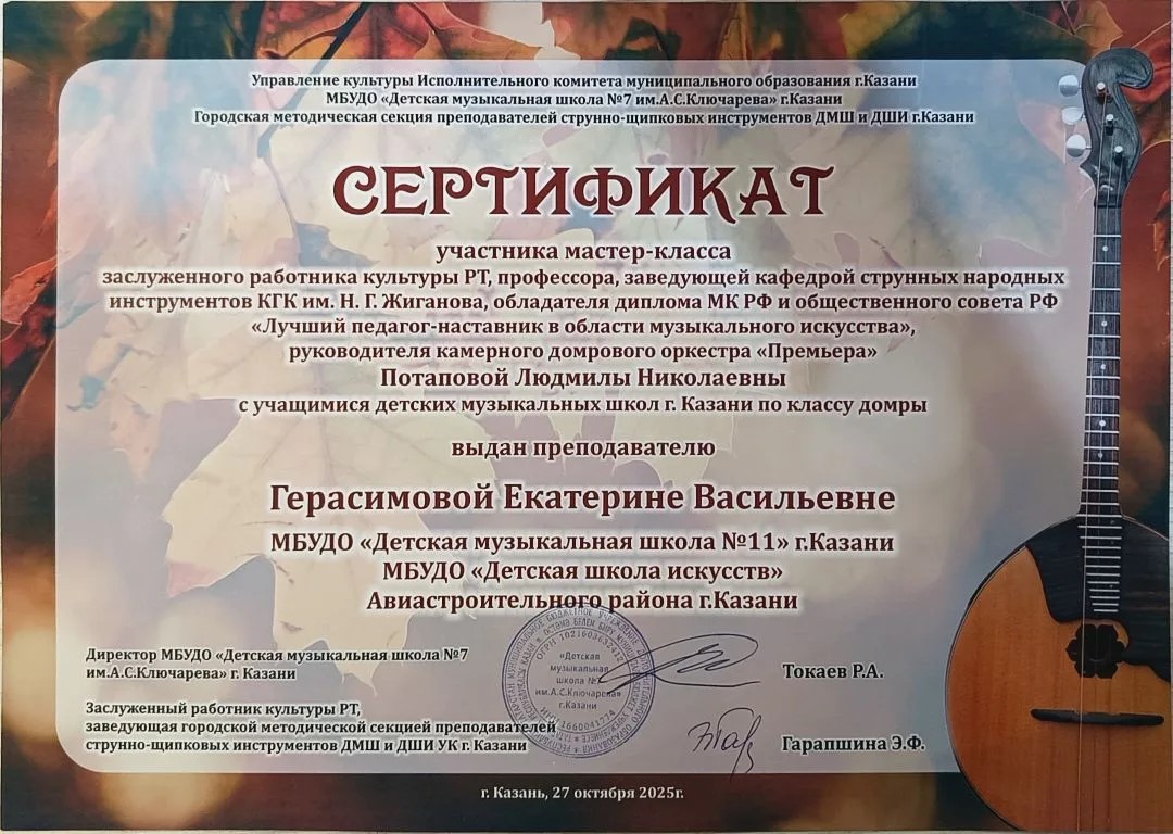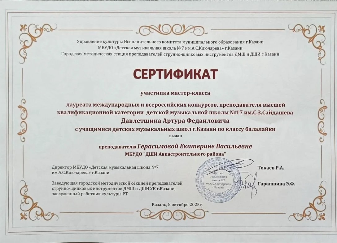 1. Городское методическое объединение преподавателей струнно-щипковых инструментов ДМШ и ДШИ г. Казани, участие в Мастер-классе преподавателя ДМШ № 17 Давлетшина А.Ф., Герасимова Е.В., Сертификат, 08.10.2025г.;