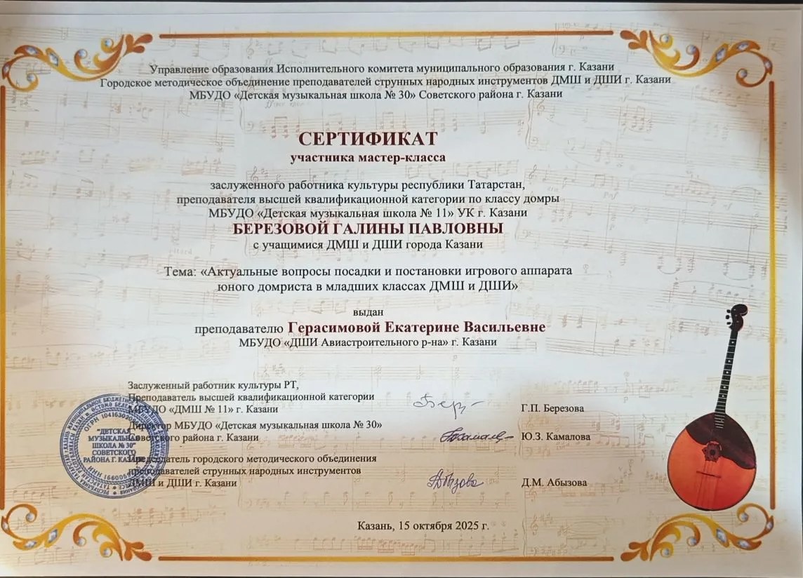5. Городское методическое объединение преподавателей струнно-щипковых инструментов ДМШ и ДШИ г. Казани, участие в Мастер-классе преподавателя ДМШ № 11 Березовой Г.П.., Герасимова Е.В., Сертификат, 2025г.;