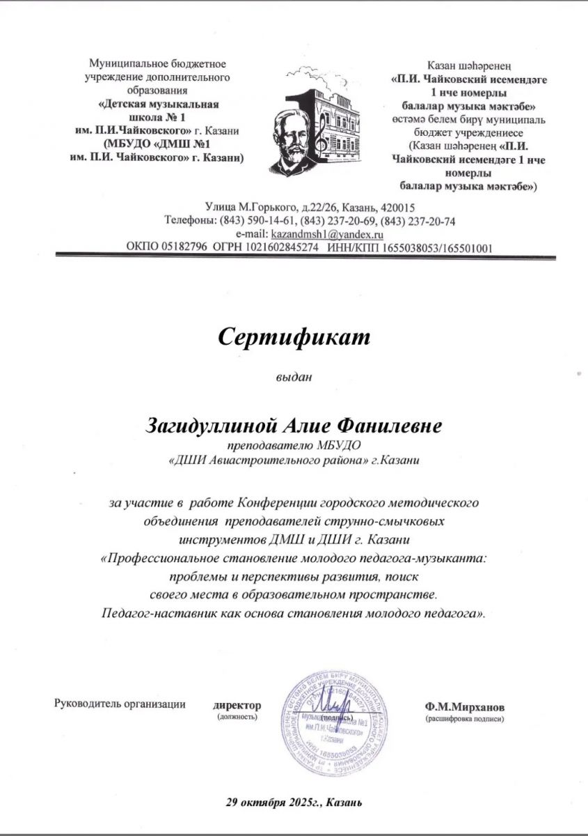 3. Конференция ГМО струнно-смычковых отделений ДМШ и ДШИ г. Казани "Профессионально становление педагога музыканта", Загидуллина А.Ф., 2025г.;