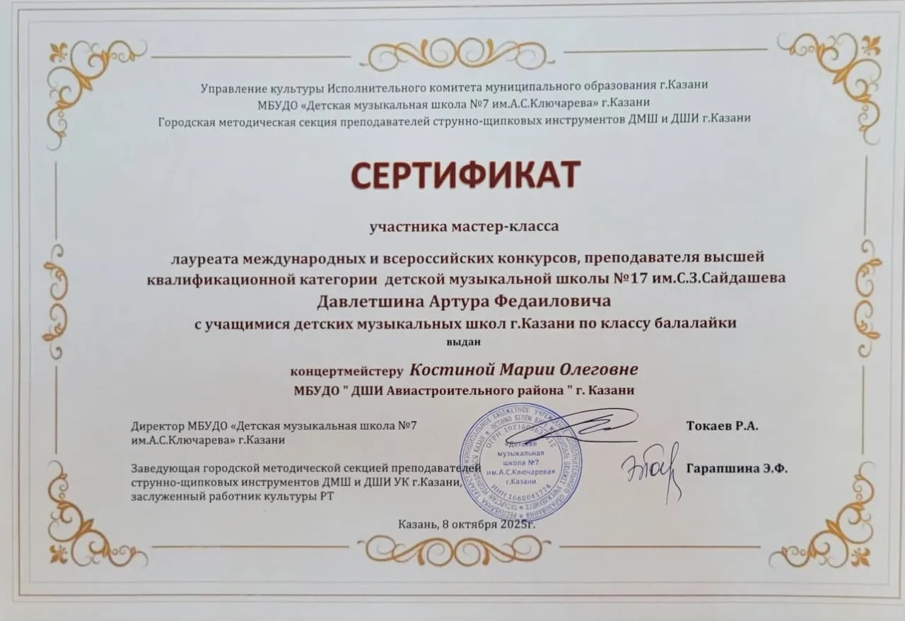 3. Городское методическое объединение преподавателей струнно-щипковых инструментов ДМШ и ДШИ г. Казани, участие в Мастер-классе преподавателя ДМШ № 17 Давлетшина А.Ф., Костина М.О. Сертификат, 08.10.2025г.;