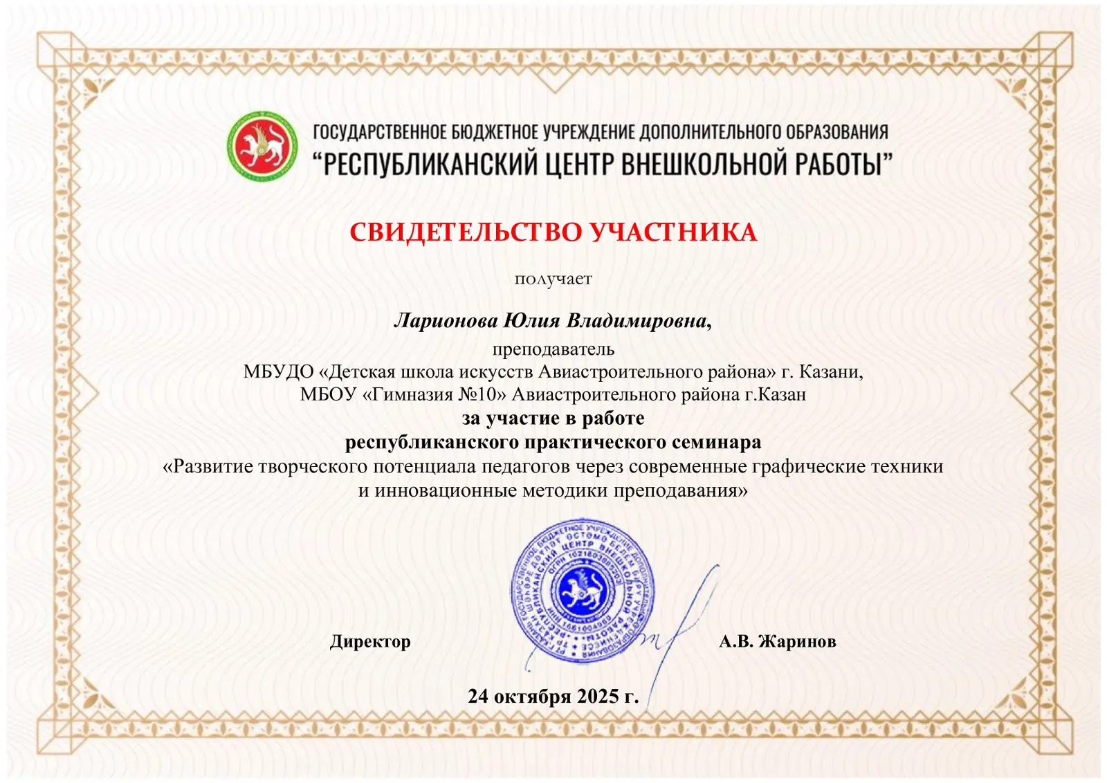 1. Республиканский практический семинар "Развитие творческого потенциала педагогов через современные графические техники и инновационные методики преподавания", Ларионова Ю.В., Сертификат, 2025г.;