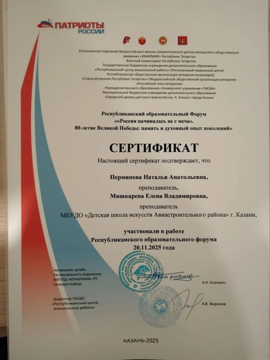 5. Республиканский образовательный форум "Россия начиналась не с меча. 80-летие Великой Победы: память и духовный опыт поколений", участие, Перминова Н.А., Мишкарева Е.В., г. Казань, 2025г.;