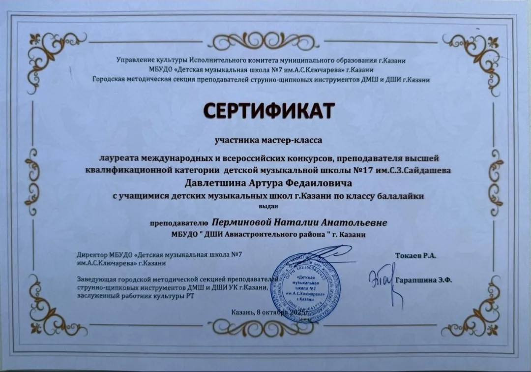 2. Городское методическое объединение преподавателей струнно-щипковых инструментов ДМШ и ДШИ г. Казани, участие в Мастер-классе преподавателя ДМШ № 17 Давлетшина А.Ф., Перминова Н.А., Сертификат, 08.10.2025г.;