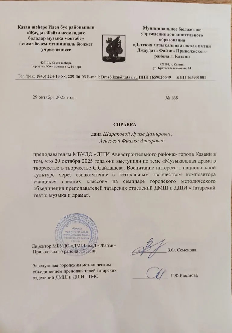 2. Городское методическое объединение преподавателей татарских отделений ДМШ и ДШИ г.Казани, Семинар "Композиторы Республики Татарстан - участники ВОВ", выступление по теме "Патриотическое воспитание учащихся на примере творчества Р.Яхина", Справка, Азизова Ф.А., Шарапова Л.Д.; 2025г., г.Казань;