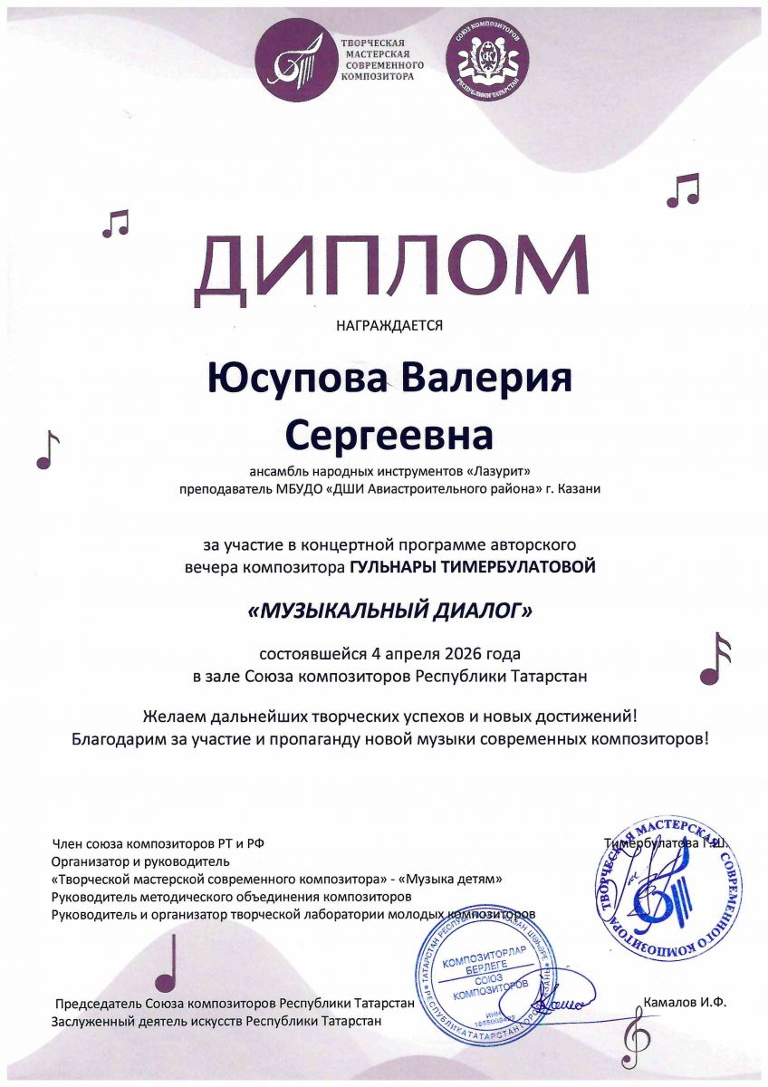 13. Авторский вечер композитора Г.Тимербулатовой "Музыкальный диалог" в зале союза композиторов РТ, Диплом, Юсупова В.С., 2026г.
