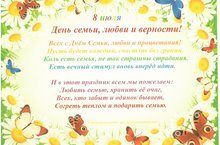 Всероссийский день семьи, любви и верности в детском саду прошел как веселый праздник-соревнование, где дети продемонстрировали свои способности в рисовании, пении, танцах. Интересно, что инициатива празднования Дня семьи поддержана всеми традиционными религиозными организациями России — ведь идея празднования Дня семьи, любви и верности не имеет конфессиональных границ. В каждой религии есть примеры семейной верности и любви. Идея праздника возникла несколько лет назад у жителей города Мурома (Владимирской области), где покоятся мощи святых супругов Петра и Февронии, покровителей христианского брака, чья память совершается 8 июля. В их жизни воплощаются черты, которые традиционные религии России всегда связывали с идеалом супружества, а именно: благочестие, взаимная любовь и верность, совершение дел милосердия и попечение о различных нуждах своих сограждан.
