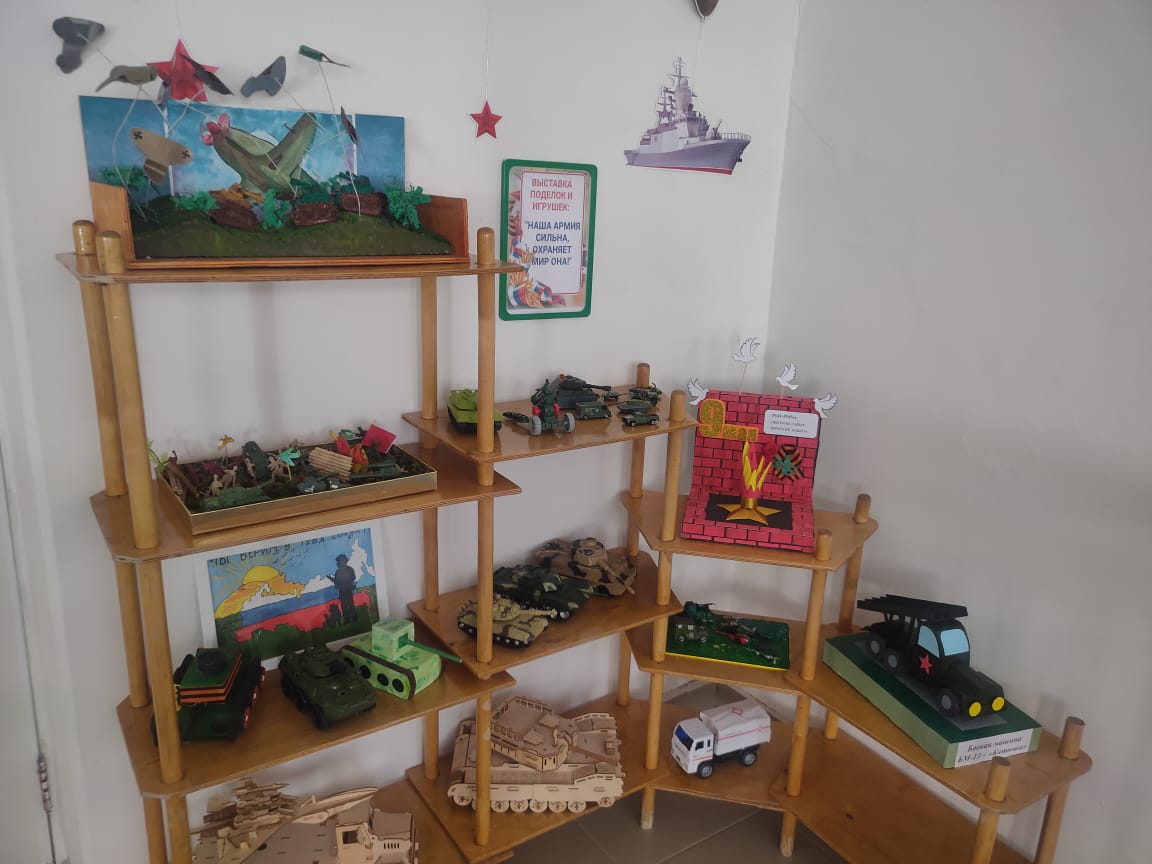 2025 год был объявлен Годом Защитника Отечества! В нашем садике была организована выставка игрушек и поделок "Наша Армия сильна, охраняет мир она!", где представлены поделки, сделанные руками детишек и их родителями, а также игрушки военной техники.