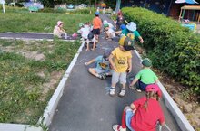 Рисование на асфальте - это не только веселое занятие, а это и творчество, и познание ребенком окружающего мира. Ведь рисовать мелом на асфальте это большее удовольствие, чем рисовать карандашами или красками на бумаге. Вооружившись, цветными мелками, дети подготовительных и старшей группы с огромным желанием, радостью и восторгом творили свои «шедевры». И вскоре асфальт превратился в мозаику неповторимых образов: солнышко и небо, дома и деревья, птички и бабочки, собачки и кошечки, цветочки, воздушные шары и лето. Воспитанники превратили серую асфальтную площадку в летнюю яркую полянку.