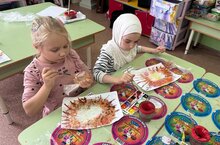 Мы с ребятами группы «Бабочки» и «Радуга» развивали художественный вкус, выражали свои чувства и эмоции в одной весёлой и несложной технике рисования – мыльными пузырями, создавая красивые цветы. Сабын куыкларында – салават күперенең барлык төсләре дә чагыла, һәрвакыт йөзләрдә елмаю һәм соклану уята. Сабын куыклары ярдәмендә рәсем ясарга да мөмкин икән бит! Бу – бик кызыклы техника, мондый техника белән ясау балаларны сөендерә. Куыкларга өреп кенә түгел, аларны төсле итеп, кәгазьгә төшерергә дә мөмкин. -