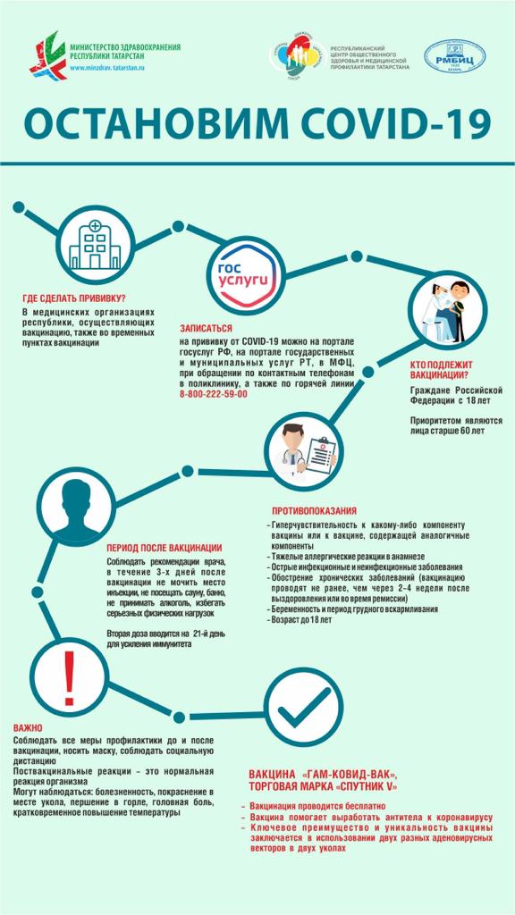 Опубликовано: 05.02.2021В Республике Татарстан проводится вакцинация населения от COVID-19. Первая вакцина от коронавируса создана учеными Национального исследовательского центра эпидемиологии и микробиологии имени Н. Ф. Гамалеи Минздрава России. Препарат уже поступил в медицинские организации Республики Татарстан, и любой желающий может получить вакцину бесплатно.