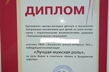 По итогам смотра-конкурса детско-юношеских театральных колелктивов для детей из школ-интернатов с ограниченными возможностями здоровья "Театральная весна" Никита К., получил диплом в номинации "Лучшая мужская роль".