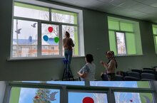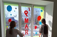 Украшение окон школы учащимися и родителями 7В класса ко Дню Победы.