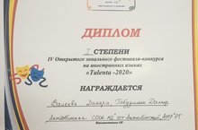 Ученики 4 В класса Валеева Диляра и Габдуллин Дамир стали дипломантами 1степени IV Открытого зонального конкурса чтецов на иностранных языках "Talenta - 2020" в г. Альметьевске.