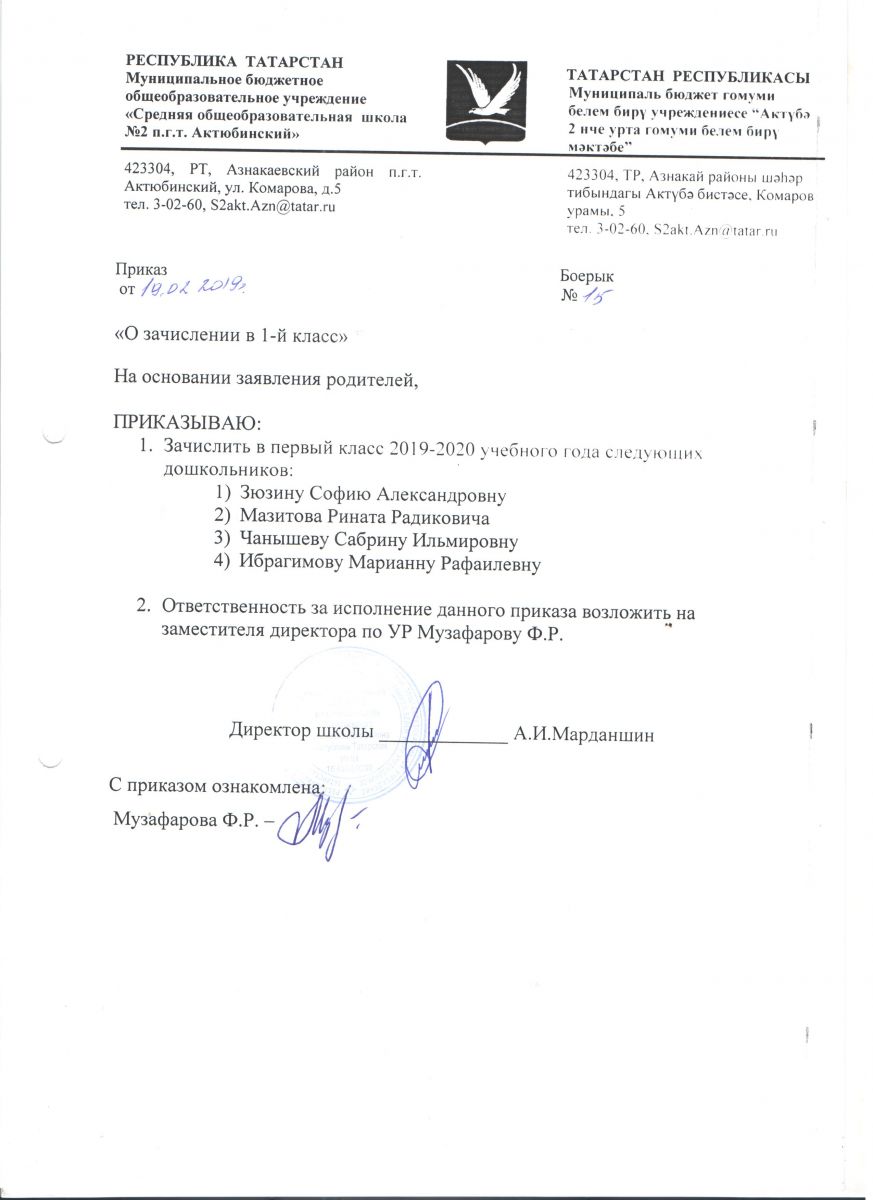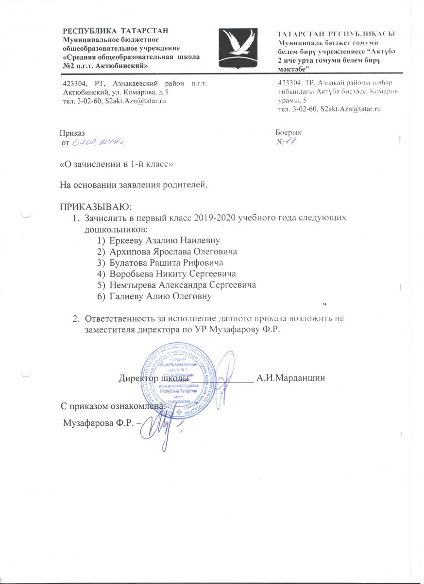 Руководствуясь приказом МОиН РФ от 22.01.2014 №32, "Об утверждении Порядка приёма граждан на обучение по образовательным программам начального общего, основного общего и среднего общего образования", информативным письмом МОиН РФ от 13.12.2016 №08-2715 «О порядке приема в общеобразовательные организации» установлен срок подачи заявления в 1 класс:для детей, проживающих по микрорайону МБОУ "СОШ №2 пгтАктюбинский" Азнакаевского муниципалього рйона РТ с 1 февраля по 30 июня 2019 года; на свободные места с 1 июля 2019 года. Информация о количестве мест в первых классах на 2019/2020 учебный год: 70 мест (3 класса)При себе иметь паспорт, копию свидетельства о рождении ребенка, справку о регистрации ребенка по месту жительства.Хөрмәтле булачак беренче сыйныф укучыларының әти-әниләре!РФ Мәгариф һәм фән министрлыгының 22.01.2014 ел, №32 боерыгы нигезендә, "башлангыч гомуми, төп гомуми һәм урта гомуми белем бирү программалары буенча белем алуга гражданнарны кабул итү тәртибен раслау турында" 13.12.2016 ел, №08-2715 боерыгы нигезендә, «гомуми белем бирү оешмаларына кабул итү тәртибе турында» 13.12.2016 ел, № 08-2715 РФ Мәгариф һәм фән министрлыгы мәгълүмати хаты белән 1 сыйныфка гариза бирү срогы билгеләнде:ТР Азнакай муниципаль районының " Актүбә ш.т.п. 2 нче урта гомуми белем бирү мәктәбе" микрорайоны буенча яшәүче балалар өчен 2019 елның 1 февраленнән 30 июненә кадәр; 2019 елның 1 июленнән ирекле урыннарга.2019/2020 уку елына беренче сыйныфларда урыннар саны турында мәгълүмат: 70 урын (3 сыйныф)Үзең белән паспорт, бала туу турында таныклык күчермәсе, яшәү урыны буенча баланы теркәү турында белешмә булырга тиеш. -