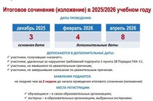 В 2025/26 учебном году выпускники 11 классов напишут итоговое сочинение в три назначенные даты. Основной день — 3 декабря 2025 года. Резервные даты предусмотрены 4 февраля и 8 апреля 2026 года. Результаты итогового сочинения становятся известны через 8–12 дней после экзамена. Их можно посмотреть в личном кабинете на портале mos.ru, а также на школьных стендах или через региональные образовательные порталы, используя личный код регистрации или номер документа.