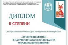 Учителя начальных классов Гарипова Лилия Рашитовна, Зиганшина Гульнара Анасовна стали призёрами республиканского конкурса методических материалов "Лучшие практики в патриотическом воспитании младших школьников". Конкурс проводил ГАОУ ДПО "Институт развития образования Республики Татарстан".