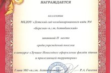 Наш коллектив занял второе место среди учреждений посёлка в конкурсе "Лучшее Новогоднее оформление фасада здания и прилегающей территории" и награждён грамотой Главы МО "п.г.т. Актюбинский"
