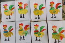 Петушки как на подбор получились, у всех красивые хвосты. Какие они нарядные! Воспитатель обратила внимание детей на сочетания цветов при рисовании и хвалила за старание.