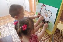 Во 2-ой младшей группе прошло итоговое занятие по аппликации с элементами рисования. Воспитатель Ключникова О.В., учила детей создавать аппликацию по знакомой сказке «Курочка Ряба», также учила создать из кусочков рваной бумаги образ курочки, выкладывая и приклеивая кусочки в пределах нарисованного контура. В конце занятия воспитатель предложила рассмотреть полученную работу и обсудить, какая получилась курочка, обязательно поощрив детей.