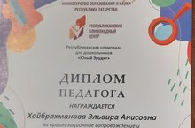 Педагоглар Хәйбрахманова Э.А., Шакирова Л. А. "Яшь Эрудит"мәктәпкәчә яшьтәге балалар өчен республика олимпиадасына укучыларны оештыру һәм әзерләү өчен дипломнар белән бүләкләнделәр. Егоров Арыслан 1 дәрәҗә Диплом; Кузеванова Сабина 2 дәрәҗә Диплом; Едутов Максим 3 дәрәҗә Диплом.