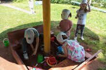 Балалар бакчасының беренче кече төркемендә ком һәм су белән уен сенсор кабул итү, вак моторика, хәрәкәтләрне координацияләү, шулай ук су һәм комның үзлекләре турында күзаллаулар формалаштыруга юнәлтелгән. Ком һәм су булган уеннар кызыксынучанлык, хыял һәм сөйләм үсешенә ярдәм итә.
