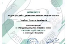 Балалар бакчасы педагоглары һәм тәрбияләнүчеләре "Экология-һәркемнең эше"II Халыкара балалар - яшүсмерләр премиясендә актив катнаштылар. "Экошкола"номинациясендә конкурс эшләре тәкъдим ителде. Педагоглар: Камилова Р. Р., Миңнәхмәтова Л. Н., Хайбрахманова Э. А., Шакирова Л.А. тәрбияләнүчеләр: Характерова Г. В., Егоров А. В., Кузеванова С. А. Мактау грамоталары һәм Рәхмәт хатлары белән бүләкләнделәр.