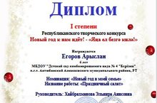 Егоров Арыслан - Диплом I степени. Номинация: "Новый год в моей семье". Название работы: "Праздничный салат". Руководитель - воспитатель Хайбрахманова Э.А.