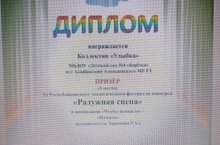Диплом, призер 3 место - коллектив "Улыбка", XI республиканский экологический фестиваль-конкурс "Радужная сцена", в номинации " Чтобы помнили" - композиция " Память". Руководитель - Зарипова Р.А.