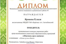 Воспитанница подготовительной к школе группы Ярмиева Рузиля стала ПОБЕДИТЕЛЬНИЦЕЙ в муниципальном конкурсе творческих работ , среди воспитанников дошкольных образовательных учреждений в номинации "Оста куллы әбием". Поздравляем нашу воспитанницу и желаем творческих успехов! Руководитль: Хабибуллина Резида Айратовна