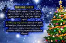 Уважаемые, любимые, родные — коллеги! Мы с вами проводим на работе так много времени, что порою ближе друг к другу, чем семья! Желаем Вам в новом году таких величайших успехов и таких больших денег, чтобы вам хватило на всё, о чём вы мечтаете! Пусть, кроме материального благосостояния, ваш внутренний мир наполнится радостью, миром, блаженством и счастьем! Любви вам — крепкой, верной и очень нежной, а дружбы — прочной и надежной. Вдохновенных вам будней и веселых праздников! Мир вашим семьям, крепкого здоровья близким и дорогим людям!
