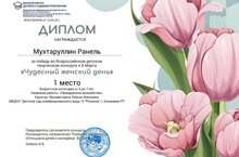 1 место во Всероссийском детском конкурсе "Чудесный женский день", Мухтаруллин Ранель, подготовительная к школе группа, руководитель Мухаметшина Л. Ф. 14.03.2025