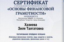 Сертификат о прохождении тестирования на тему:"Основы финансовой грамотности" был присвоен воспитателю Хазиевой Зиле Талгатовне 20.01.2025