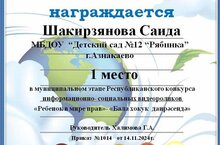 В муниципальном этапе Республиканского конкурса информационно-социальных видеороликов "Ребенок в мире прав" - "Бала хокук даирәсендә" воспитанницу старшей группы Шакирзянову Саиду наградили грамотой за 1 место 21.01.2025