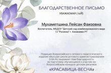 Благодарственное письмо Мухаметшиной Лейсан Фаизовне за подготовку и участие во Всероссийском конкурсе детских рисунков "Красавица весна" 09.04.2025