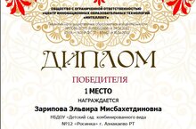 Диплом победителя 1 место награждается Зарипова Эльвира Мисбахетдиновна в Республиканском конкурсе посвященному Международному дню родного языка "Роль родного языка в воспитании детей в ДОУ" 11.04.2025