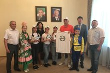 Встреча с Главой… 20.06.2018Делегация школы во главе с директором Хамидуллиным Г.М. побывала на приеме у Марселя Зуфаровича и преподнесла сувениры с символикой акции «Мин татарча сойлэшэм».