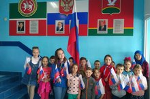 Воспитанники пришкольного лагеря совместно с вожатыми раздавали жителям ленточки с российским триколором.