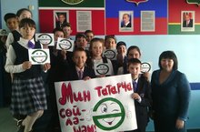 Мәктәп автобусларынннан “Мин татарча сөйләшәм” логотипы районыбыз халкына акция турында хәбәр итеп тора.Тел кешене дус итә,