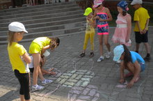 Дети очень любят рисовать, поэтому с энтузиазмом взялись за цветные мелки и уже через несколько минут асфальт перед школой буквально светился от детских «солнышек» и цветов.