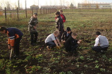 На пришкольном участке - сбор моркови, свеклы, фасоли.Все, что вырастили , сдали в школьную столовую.