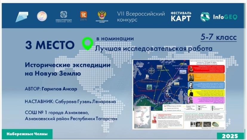 В завершении недели географии спешим поздравить ученика 5а класса Гарипова Ансара-призера, ученицу 5б класса ШаймардановуЗалину-участника XII конкурса геоинформационных технологий и программирования «Фестиваль карт-2025», организованного Детским технопарком «Кванториум» г. Набережные Челны и федеральным государственным бюджетным образовательным учреждением дополнительного образования «Федеральный центр дополнительного образования и организации отдыха и оздоровления детей. Желаем дальнейших успехов и новых творческих идей!