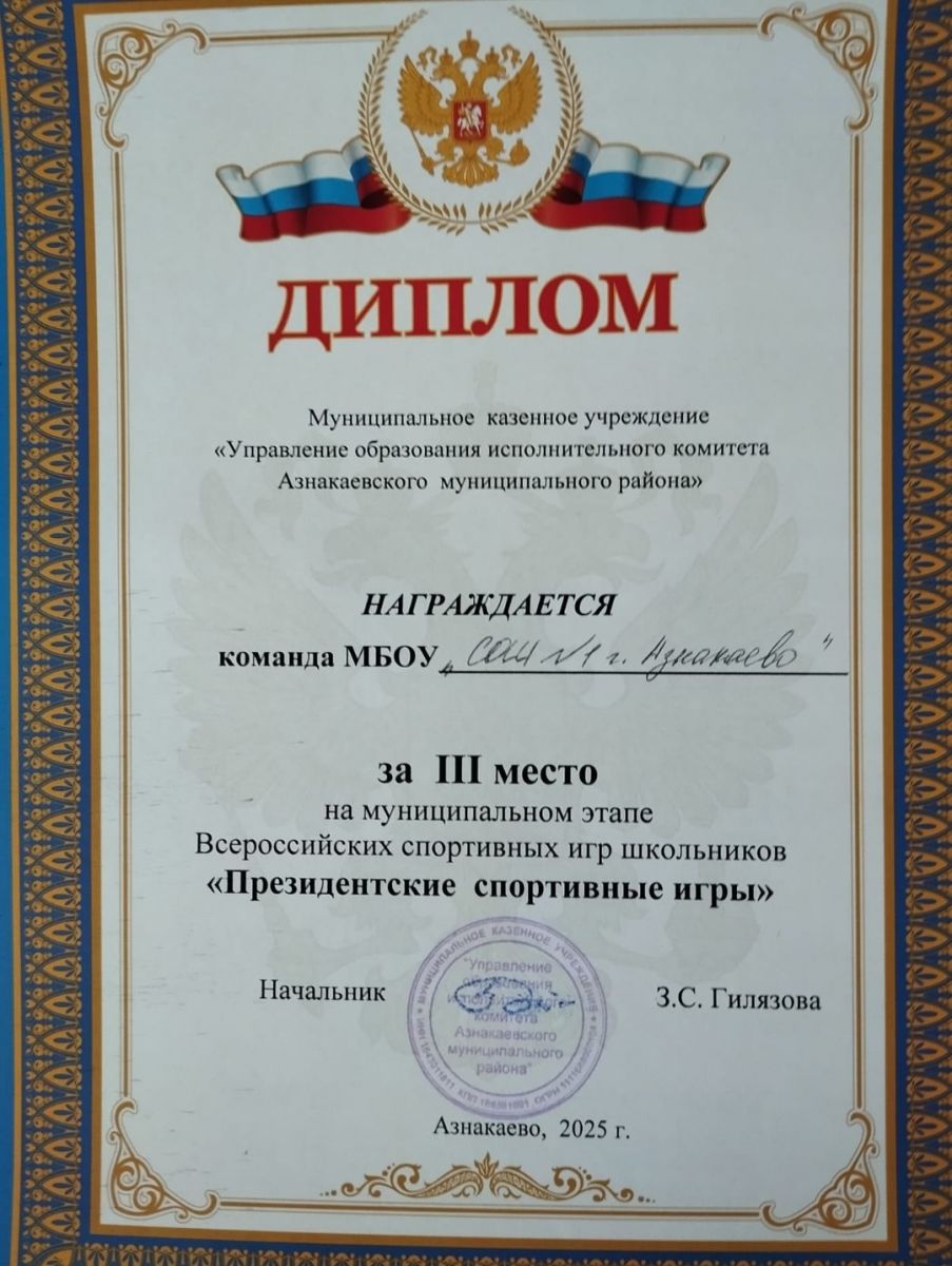 Мәктәп укучыларының «Президент спорт уеннары» ярышларының муниципаль этабы тәмамланды, анда безнең мәктәпнең 2010-2011 елгы укучылары катнашты.Безнең команда 3 нче урынны алды.Барлык катнашучыларны да котлыйбыз.Сезгә алга таба да уңышлар, яңа җиңүләр телибез!