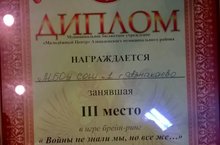 3 место в городской интеллектуальной игре брейн-ринг "Войны не знали мы, но всё же..." 30.04.2016