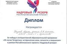 Якупов Азат, ученик 8 класса, стал победителем в интерактивной образовательной программе "95-летие Татарстана: исторические вехи, личности и свершения" в рамках Республиканского проекта "Кадровый резерв". Поздравляем! Так держать!