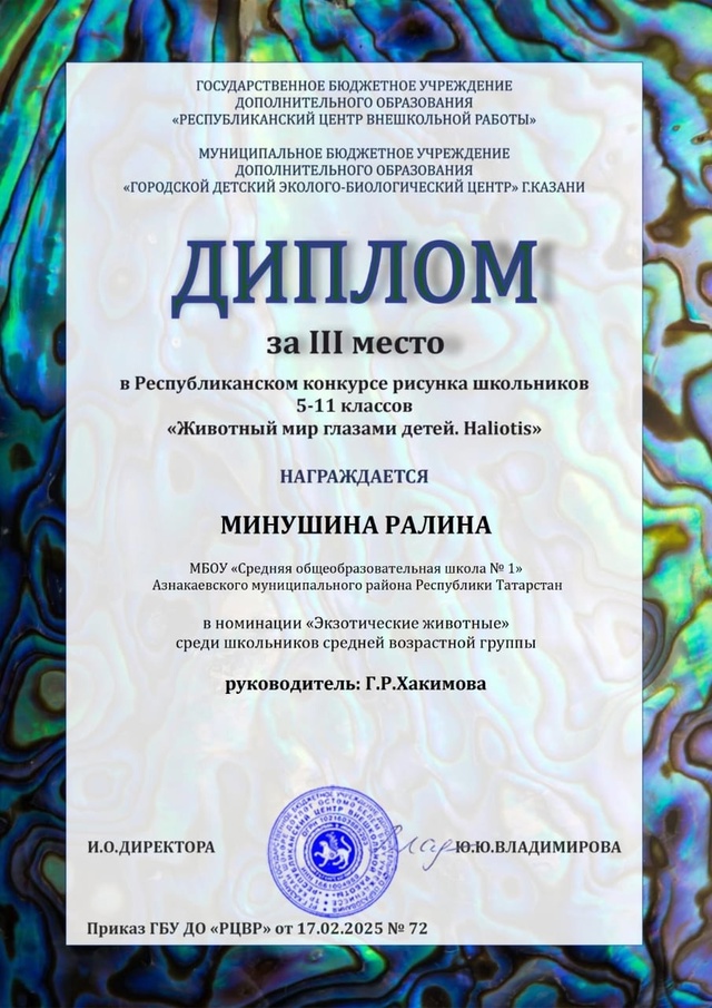 7а сыйныфы укучылары Галимова Ралина, Минушина Ралина " хайваннар дөньясы балалар күзләре белән. Haliotis"республика рәсем конкурсында призерлар булдылар. Котлыйбыз! Җитәкчесе: Хакимова Г. Р.