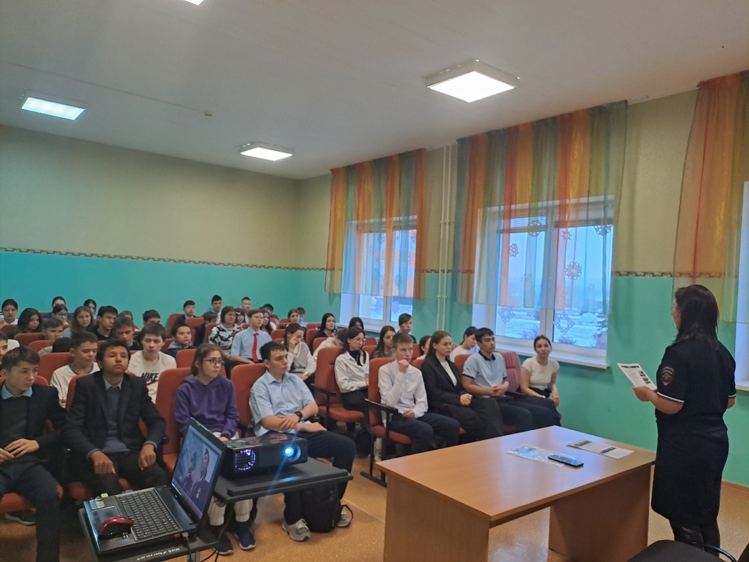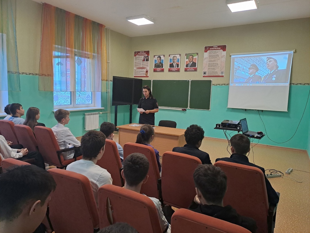 Азнакай шәһәре һәм муниципаль районы полиция бүлегенең кадрлар бүлеге начальнигы В.И. Гатауллина белән очрашу булды. Ул 8,11 класс укучылары өчен Россия Эчке эшләр министрлыгының юридик уку йортларына керү мөмкинлекләре турында аңлату-һөнәри юнәлеш бирү әңгәмәсе үткәрде.