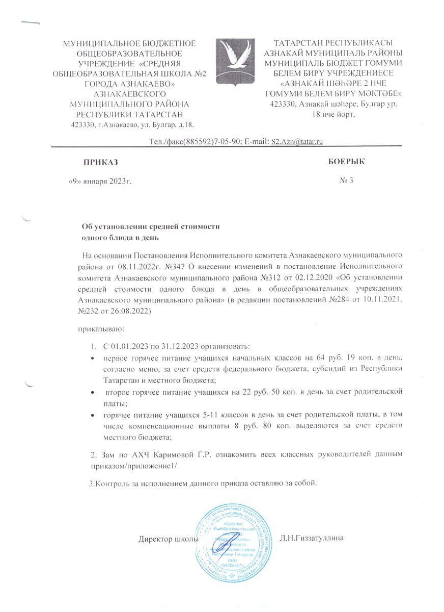 Приказ МБОУ "СОШ №2 г. Азнакаево" от 31.08.2023г. №371 "Об организации горячего питания"